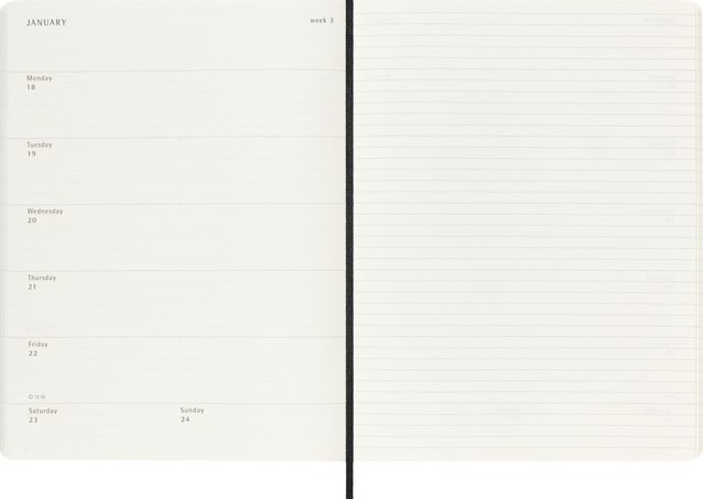 De Moleskine Weekly Notebook Planner is gedateerd van januari tot december. Het is een handige en veelzijdige planner die de vrijheid van een notitieboekje bevat en is ingedeeld met de afspraken van de week aan de linkerkant en een gelinieerde pagina voor notities op de rechter bladzijde. Het notitieboekje is beschikbaar met een harde of een zachte kaft met afgeronde hoeken en een elastische sluiting.- Harde of Zachte kaft- Afgeronde hoeken- Elastische sluiting- Moleskine ivoorkleurig papier- Papiergewicht: 70 g/m²- Handige tools: planning, tijdzones, internationale metingen, toegangscodes en vluchtduur- Uitbreidbaar binnenvak passend bij de kleur van het notebook- "In geval van verlies" label gedrukt op het schutblad- Bijpassende bladwijzer voor lint- Herbruikbare paperband B-SIDE met extra gedrukte tools- 180° liggende opening- Moleskine srl. creëert en verkoopt FSC-gecertificeerde producten