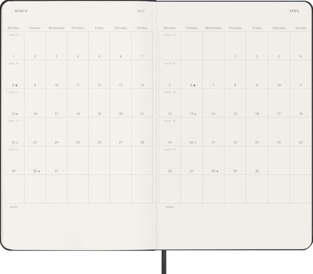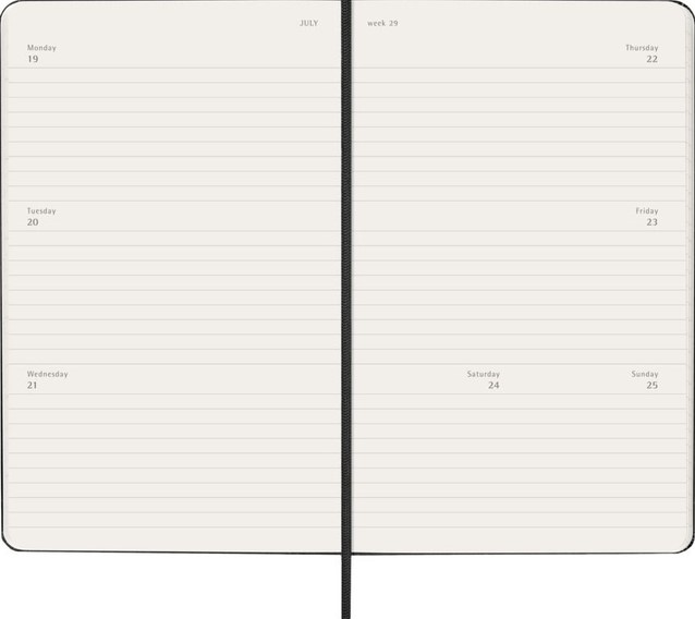 De Moleskine Horizontal Weekly Planner is gedateerd van januari tot december. Deze populaire planner is ingedeeld in een horizontaal formaat om elke week op twee pagina's te laten zien (maandag t/m woensdag aan de linkerkant, donderdag t/m zondag aan de rechterkant). De planner heeft afgeronde hoeken en een elastische sluiting. Gevuld met prachtige, ivoorkleurige pagina's, met genoeg ruimte voor uw eigen inbreng evenals handige tools.- Harde of Zachte kaft- Afgeronde hoeken- Elastische sluiting- Moleskine ivoorkleurig papier- Papiergewicht: 70 g/m²- Handige tools: planning, tijdzones, internationale metingen, toegangscodes en vluchtduur- Wereldwijde feestdagenkalender verkrijgbaar via moleskine.com/diaryaddons- Uitbreidbaar binnenvak passend bij de kleur van het notebook- "In geval van verlies" label gedrukt op het schutblad- Bijpassende bladwijzer voor lint- Herbruikbare paperband B-SIDE met extra gedrukte tools- 180° liggende opening- Moleskine srl. creëert en verkoopt FSC-gecertificeerde producten