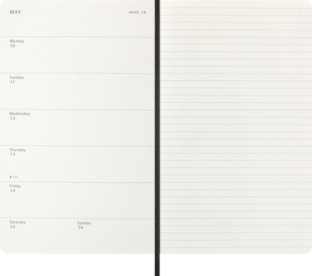 De Moleskine Weekly Notebook Planner is gedateerd van januari tot december. Het is een handige en veelzijdige planner die de vrijheid van een notitieboekje bevat en is ingedeeld met de afspraken van de week aan de linkerkant en een gelinieerde pagina voor notities op de rechter bladzijde. Het notitieboekje is beschikbaar met een harde of een zachte kaft met afgeronde hoeken en een elastische sluiting.- Harde of Zachte kaft- Afgeronde hoeken- Elastische sluiting- Moleskine ivoorkleurig papier- Papiergewicht: 70 g/m²- Handige tools: planning, tijdzones, internationale metingen, toegangscodes en vluchtduur- Uitbreidbaar binnenvak passend bij de kleur van het notebook- "In geval van verlies" label gedrukt op het schutblad- Bijpassende bladwijzer voor lint- Herbruikbare paperband B-SIDE met extra gedrukte tools- 180° liggende opening- Moleskine srl. creëert en verkoopt FSC-gecertificeerde producten
