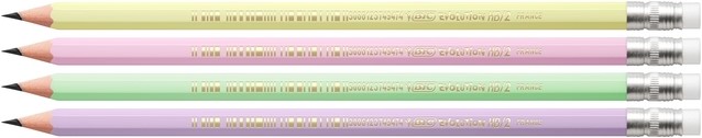 BIC Evolution HB grafietpotlood met gom in 4 vrolijke en trendy pastel kleuren . De HB-stift is schokbestendig en eenvoudig uit te gommen. Dit is het perfecte potlood om mee te tekenen en schrijven, het is houtvrij duurzaam HB grafietpotlood gemaakt uit 52% recycled materiaal. Een mix van 4 zachte pasteltinten, 3 van elke kleur (groen, geel, roze en paars) om je creativiteit de vrije loop te laten en sombere etuis op te fleuren. Het BIC Evolution Pastel potlood is een hoogwaardig potlood met een stevige HB-stift die je in een handomdraai kunt slijpen. Deze potloden worden gemaakt in de Europese BIC-fabrieken, en je kunt dus rekenen op compromisloze kwaliteit. BIC maakt al meer dan 65 jaar hoogwaardige schrijfinstrumenten voor elk budget, die over de hele wereld verkocht worden.